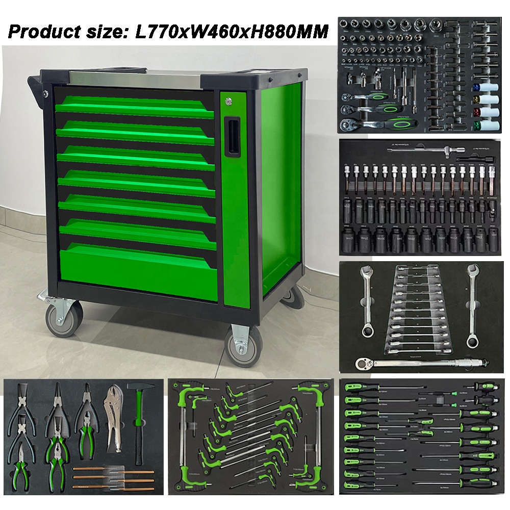 Heavy-duty steel cabinet with 7 drawers containing 200 mechanic tools made of CR-V. Designed for garage and workshop use. OEM & ODM supported.